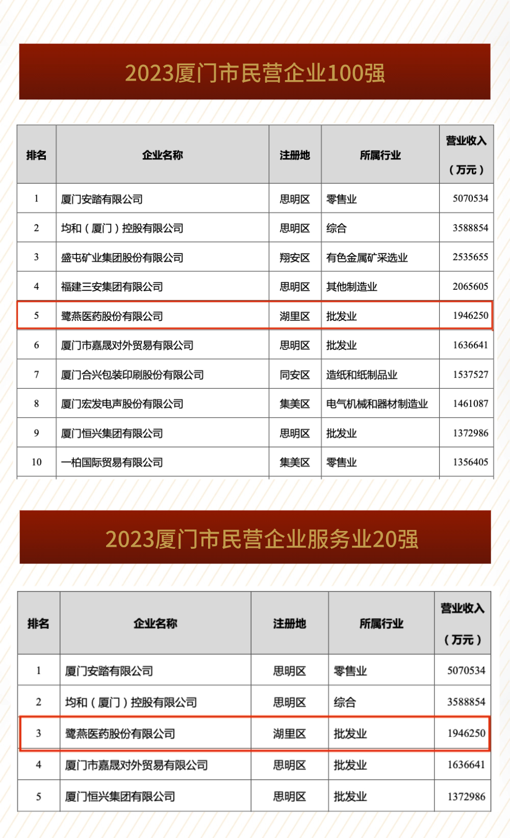 2023廈門企業百強揭曉,鷺燕醫藥榮列第16位!