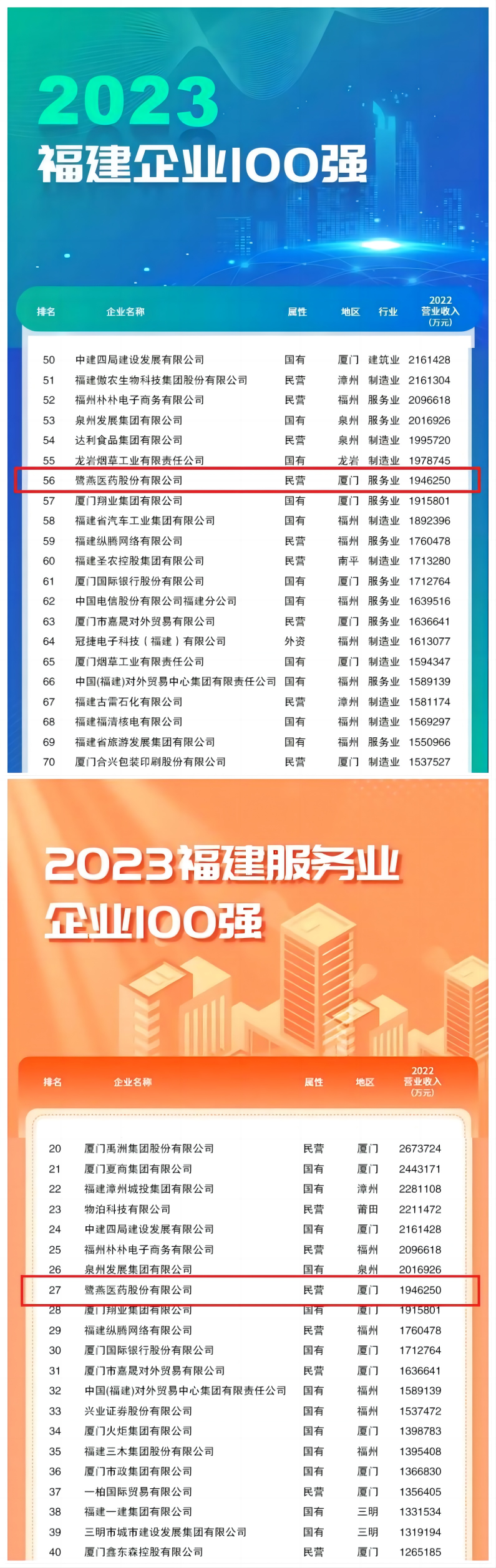 鷺燕醫藥股份有限公司本次榮登《2023福建企業100強》榜單第56位、在《福建服務業企業100強》排名第27位!
